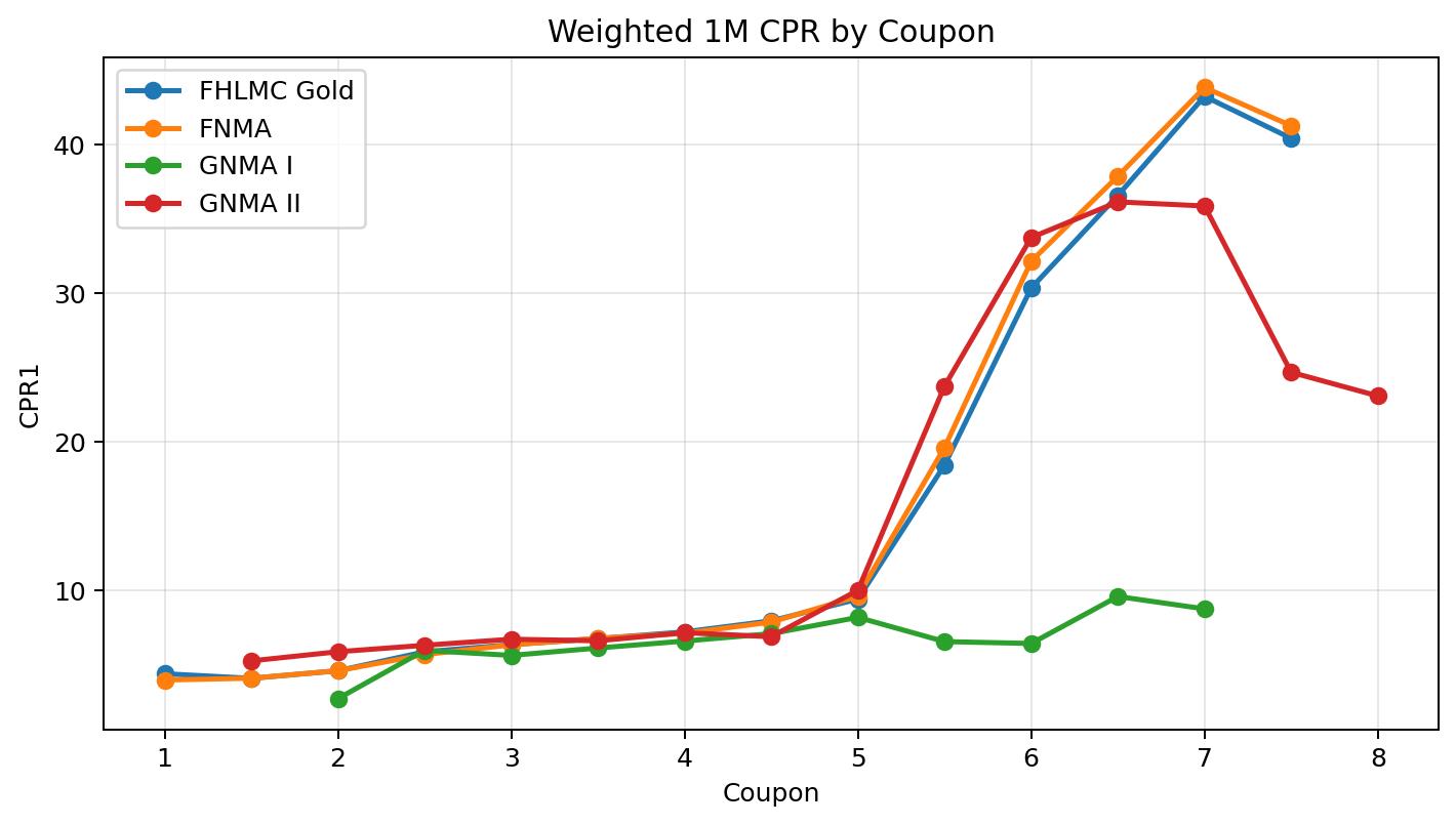 1. Family-level prepayment map Weighted CPR1 rises monotonically with coupon in the conventional stack, while GNMA II prints systematically faster in lower coupons and much faster in 5.5% - 6.0% premiums. GNMA I high-coupon readings are much slower, but float is small and should be treated as niche / sample-sensitive rather than market-clearing.
