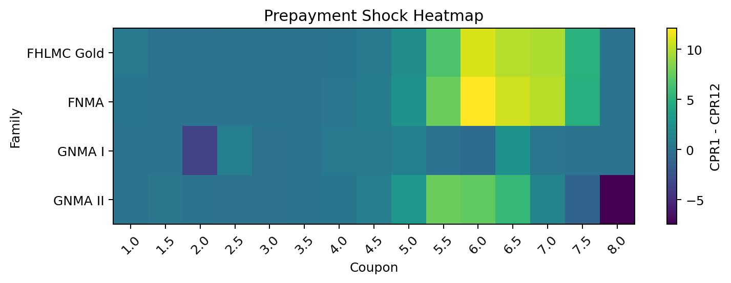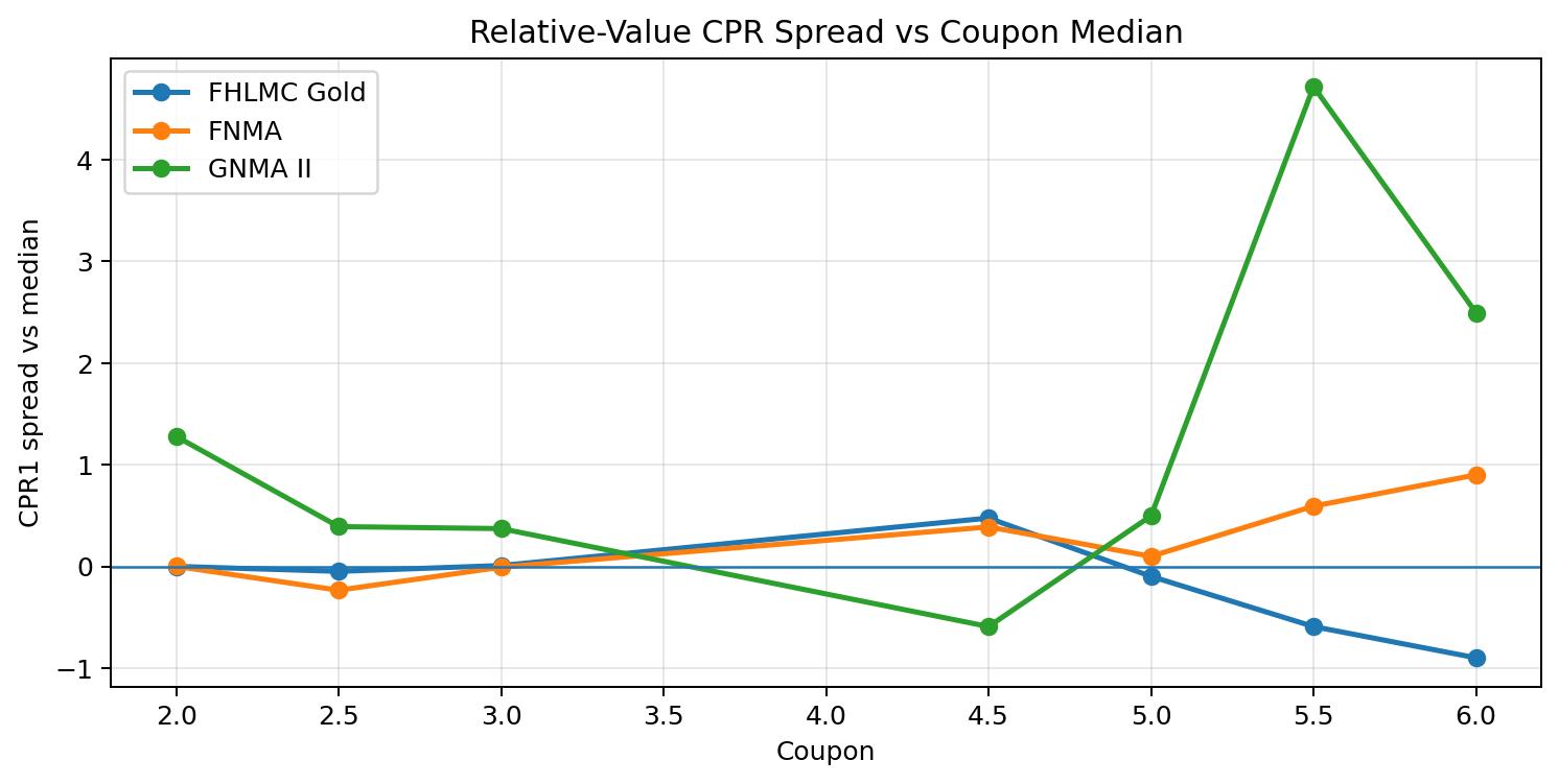4. Relative-value analysis RV is evaluated within coupon by family. For discounts (<=2.5), faster speeds are preferred because they reduce extension drag. For premiums (>=5.0), slower speeds are preferred because they preserve price and reduce premium burn. For current coupons, names closest to the coupon median speed are preferred because they give the cleanest carry without extreme convexity.