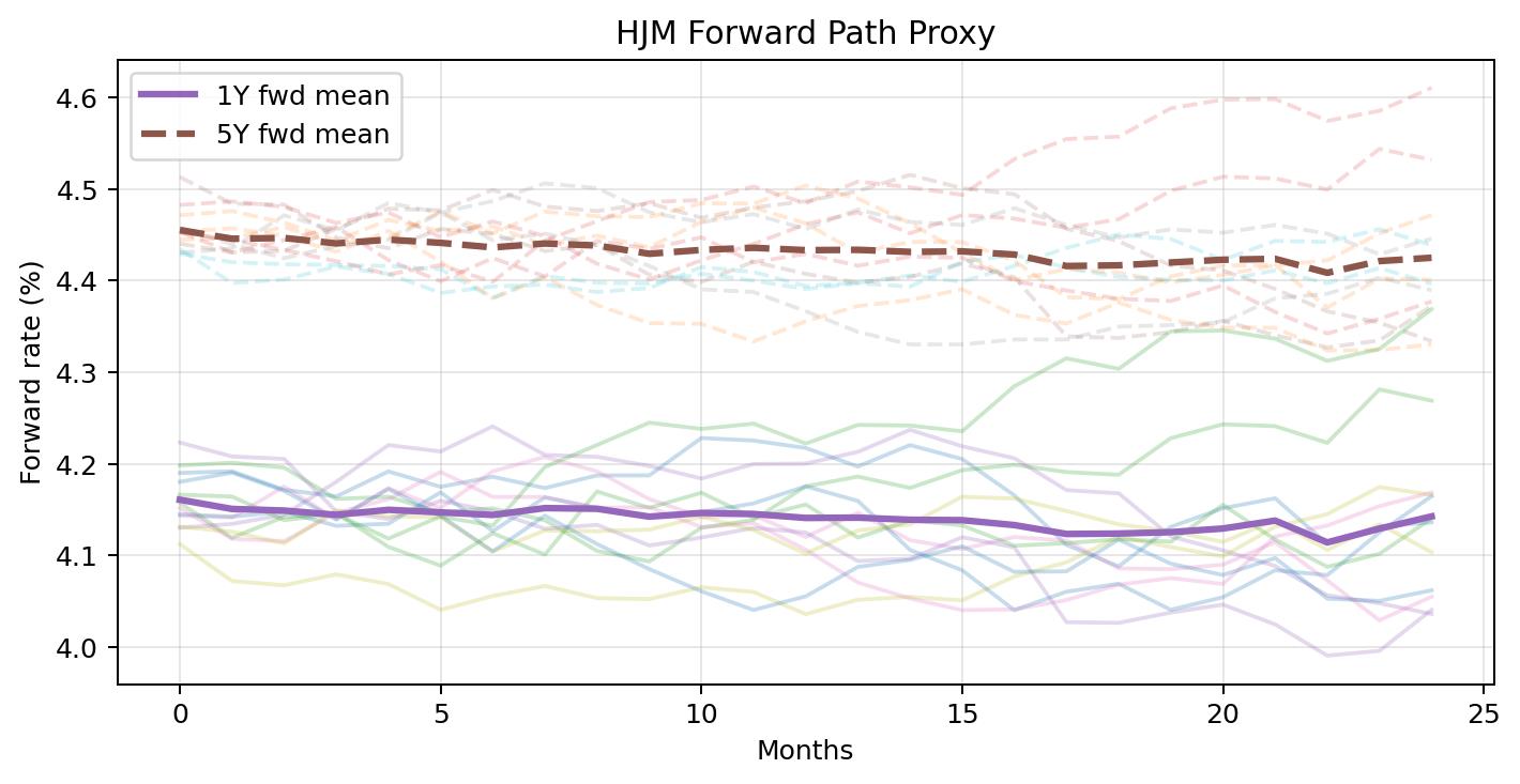 Fannie (FNMA) WA CPR 9.7%, Freddie (FHLMC) 7.6%, Ginnie I 6.7%, Ginnie II 13.5%. Ginnie II remains the speed outlier with much faster prepayments on high coupons (5.5–6.0%), while Fannie and Freddie show steadier behavior in production coupons (4.0–5.0%). Curve Context Forward yield curve (HJM simulation, 3,000 paths) assumes mild steepening—front-end easing, long end sticky. This supports production coupons and penalizes premium cohorts. Key Observations • G2 5.5s–6.0s: CPR 23–30%, large balances, premium erosion risk. • FN 4.5s–5.0s: CPR mid-single digits, balanced carry and convexity. • FH 4.0s–4.5s: Slightly calmer than FN, attractive carry sleeve. • Deep discount FN/G2 2.0–2.5s: Long WAM, extension-heavy.