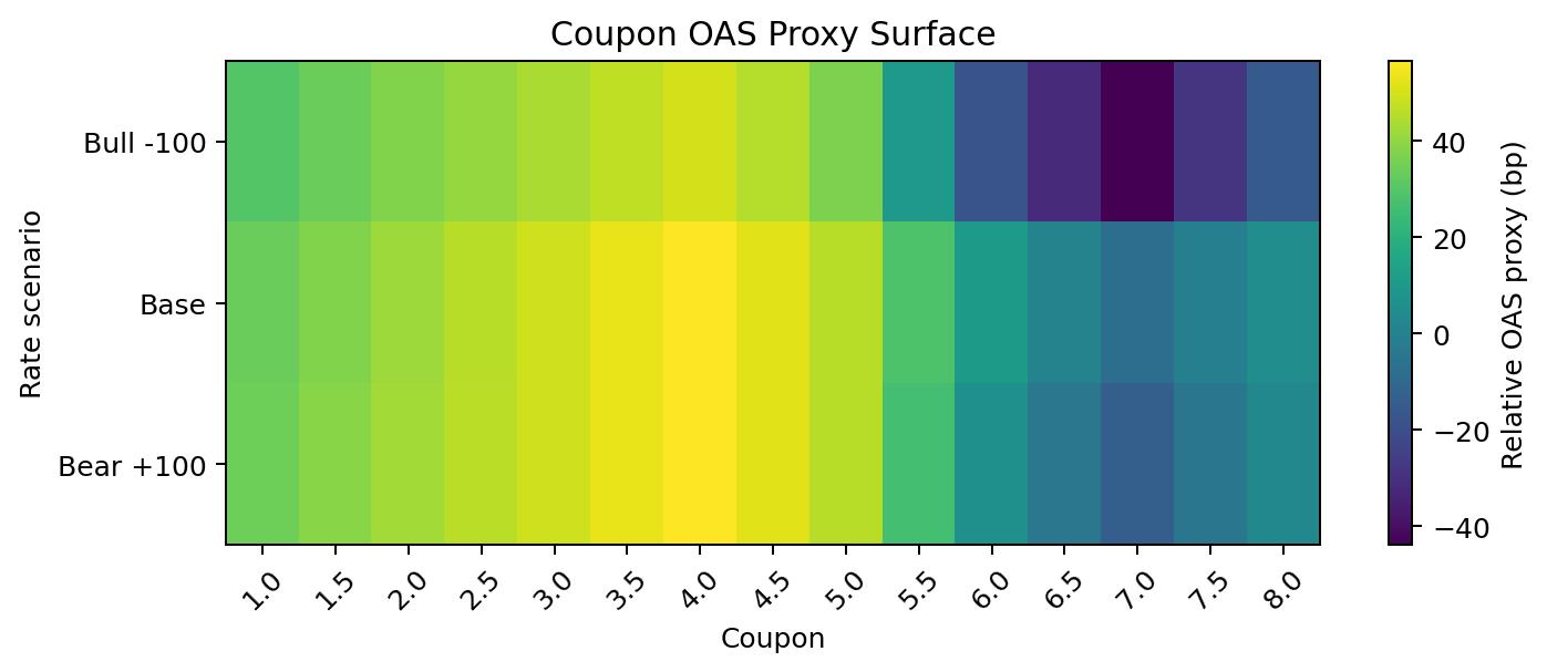 2. HJM proxy state and coupon OAS surface The HJM lane is used as a rate-state anchor rather than a dealer mark engine. We project 1Y and 5Y forward anchors under a two-factor mean-reverting proxy and then map prepayment sensitivity into a relative OAS surface by coupon under bull / base / bear scenarios. Bull scenarios punish premiums through faster refinance paths; bear scenarios slightly help discounts by reducing extension pressure.